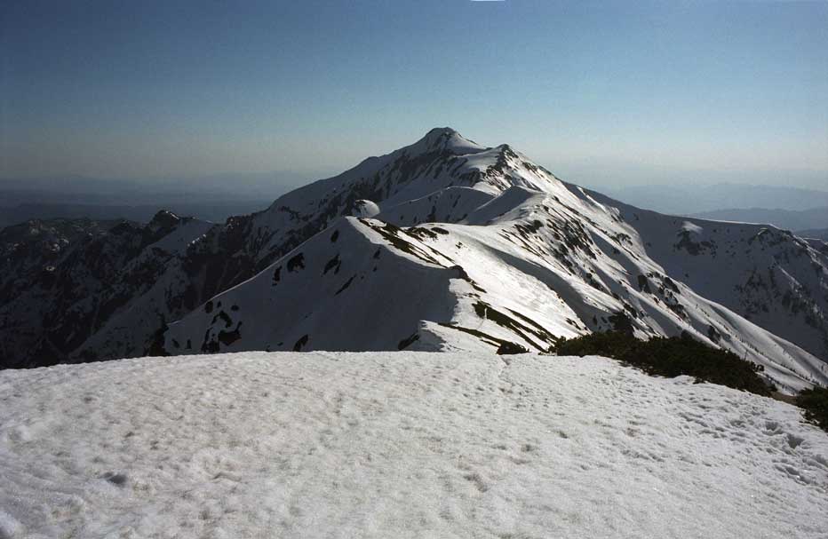 2001年5月13日、北アルプス・抜戸岳2813mより「笠ヶ岳2898m」を写す。