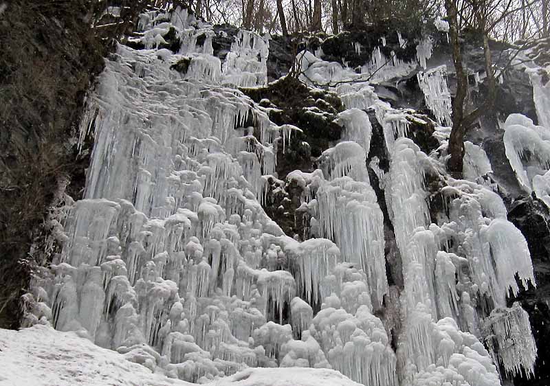 滝の上流の深い谷から流れ落ちる水が巨大な氷柱を造りあげていました。