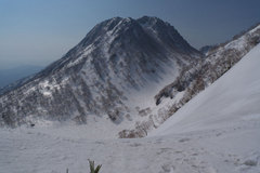 お久しぶりです。FURAIBOUは、山仲間と新潟県の山である「火打山2462.0m と妙高山2445.9m」に登ってきました。5月4日〜5日の両日ともに、絶好の登山日和に恵まれて豪雪地の雪山を満期してきました。写真は、大倉乗越(妙高山外輪山)より望む妙高山本峰。眼下に長助池の雪原、その雪原から険しく立ち上がる妙高山。外輪山は内輪に向かって雪庇が大きく張り出し、一気に切れ落ちている。大倉乗越からは内輪の雪原に降りられなくもないが、ここから妙高山本峰を往復すると、4時間近くはかかるであろう大変なアルバイトが待っている。眼下の雪原はもちろん、本峰にも登山者の姿は見受けられなかった・・