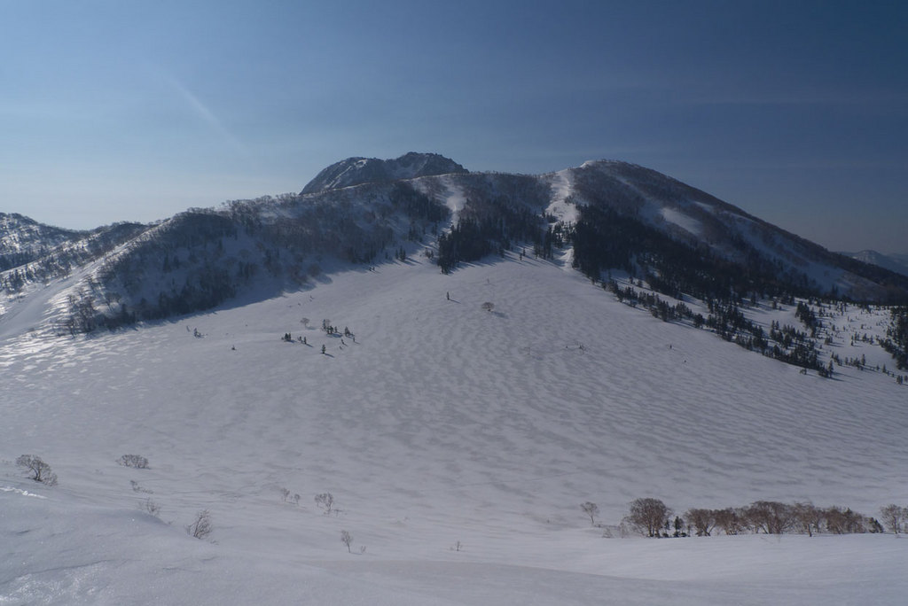茶臼山2171mから望む妙高山。写真には写っていないが、左端に「黒沢ヒュッテ」の瀟洒な小屋が立つ。大雪原と妙高山の素晴らしいロケーションが広がっている。牧歌的な火打山〜妙高山の雪原は、どこでも自由に散策することが出来るので、楽しい!