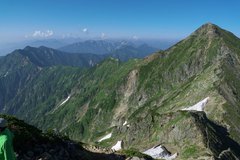 五竜岳に向かう鹿島槍ヶ岳南峰の下りは険しい。最初、山頂の岩峰群を北面から回り込むようにしてトラバースし、それから吊尾根目指して急峻な岩場を一気に下る。浮き石が多いので、周りの登山者に迷惑がかからないよう慎重な歩行が大切だ。安全地帯まで下り切ってホッとしていると、山のような岩屑がガラガラと転げ落ちてきた。登りのパーティが石を落としたようだ。逃げ場のない登山道なので、細心の注意を払ってもらいたいものだ・・