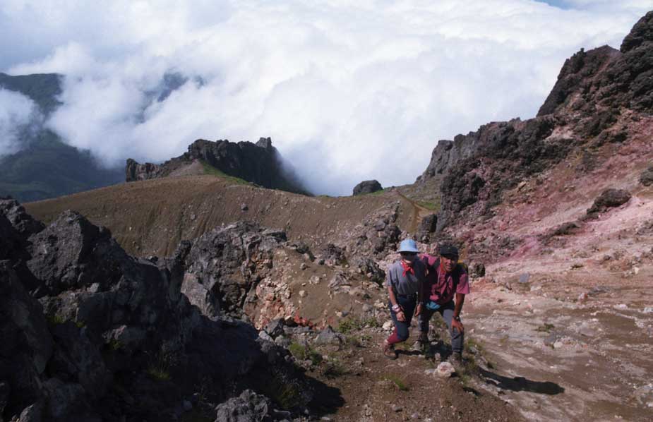 荒涼とした景色が広がる山頂。雰囲気としては、上高地の「焼岳」に似ている。活火山で立入禁止区域、当然ながら人影は皆無だ。良い登山者は、真似をしないこと。