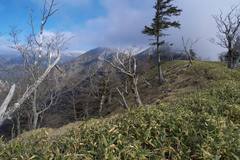 稜線の「等高尾根」分岐点から北方を望む。中央左手の山は「鎌崩ノ頭2075m」で、右手の木立に邪魔されて見えるのが「丸盆岳2066m」だ。丸盆岳は、美しい笹原と眺望に恵まれた名峰と呼ぶにふさわしい山だが、晴れ間が広がっていたのはほんの束の間で、深いガスに覆われて展望は皆無だった。眺望を満喫するのは、次回の楽しみとしよう・・