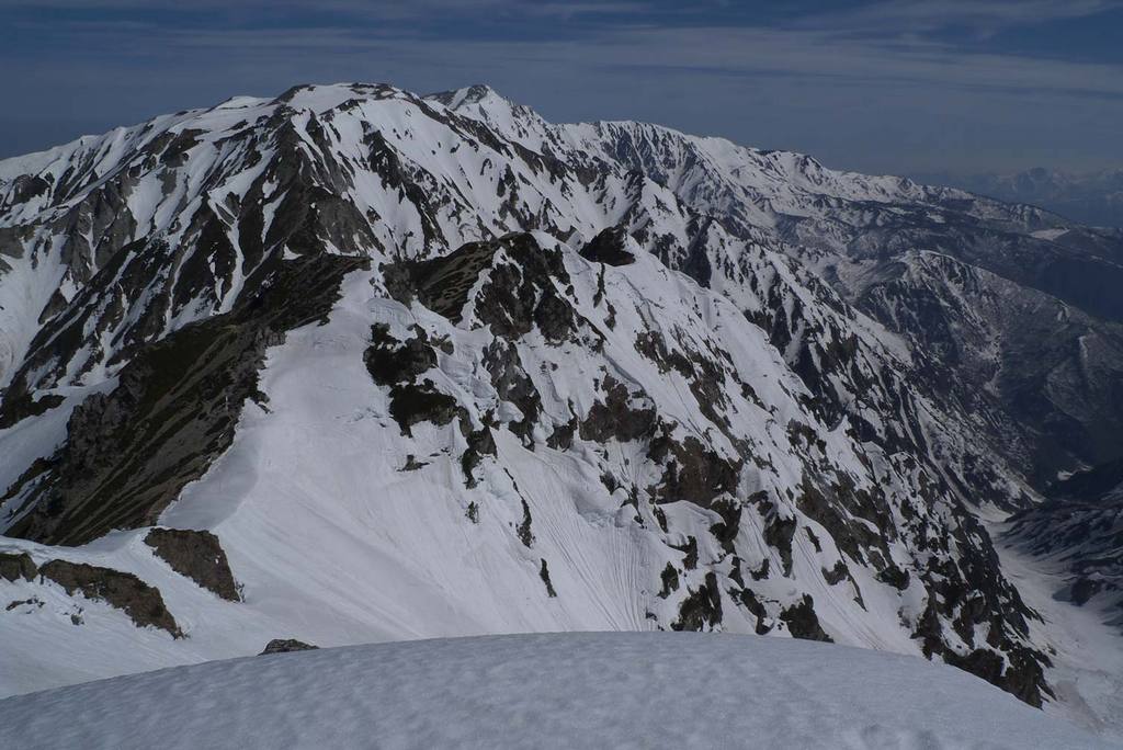 眼下の登攀者は、登る気配を見せない。不帰峰の支尾根は、クライマーに人気が高い雪稜コースだが、こうも岩肌が露出していて雪が少ないと、登る興味も失せてしまうのだろう。八方尾根を下山中のヘルメットを掲げた登山者に「不帰峰ですか?」とたずねると、「あきらめました」の声が返ってきた。