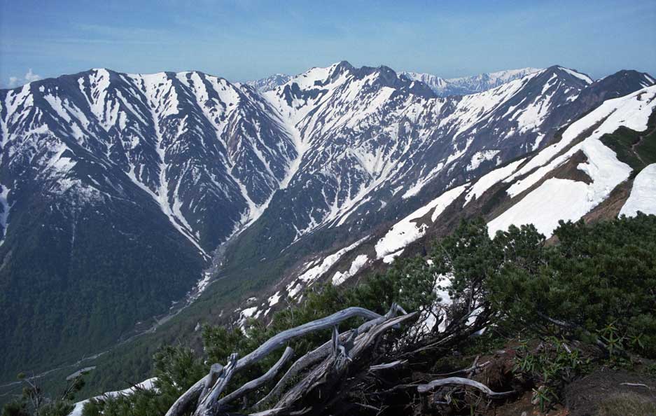 扇沢ベースの後立山連峰は、入山のしやすから良く登る山域である。丁度、針ノ木峠の山開きが催された日で、混雑を避けて種池〜岩小屋沢岳〜新越乗越〜針ノ木岳の環状コースをのんびり歩いた。針ノ木峠に着くと、200人ばかりの登山者達がまだ下っている最中で、雪渓はぐずぐずの田圃のようになっていた。