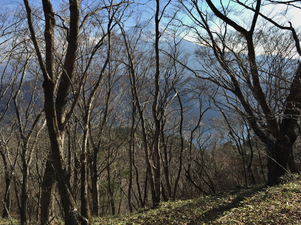 十二ヶ岳山頂より、桑留尾(くわるび)コースを下る。冬枯れた木立に広がる笹原、細波に輝く西湖の湖面、青空にくっきり浮かび上がる雪を抱いた富士山・・。いやいや出掛けた山歩きであったが、素晴らしいローケーションに感激してしまった。