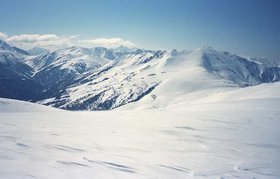 双六岳から黒部五郎岳〜薬師岳に至る北アルプスの稜線をダイヤモンドコースと呼び、山スキーヤー憧れの地です。ラッセルに苦しめられながら、3日掛かりで北ノ俣岳稜線に上がると、まばゆいばかりの大雪原が広がります。黒部五郎岳の左手遥か彼方に槍ヶ岳の鋭峰が写り、今までの疲れが吹き飛びました。