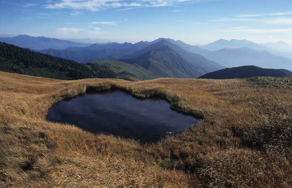 広い山頂には、池塘が点在し、美しい景色が広がる。直ぐにも下山しなければならない時間だが、登山者の絶えた頂でこの風景を堪能していた。正面は、巻機山から朝日岳に連れなる稜線。その右手は、谷川連峰。左手に上州武尊山が・・・
