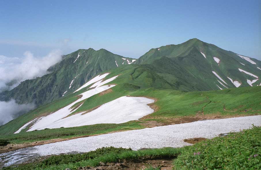 飯豊連峰は豪雪地帯なので、夏でも稜線には残雪が多く残る。池塘やお花畑が広がる人気の高い山ではあるが、北アルプス辺りから比べると登山者は少なく、静かな山歩きを堪能できる。残雪を抱いた優美な大日岳の景色に見とれ過ぎて、水の補給を怠ってしまい、後々飲料水ゼロという辛い目にあってしまうのだが・・・。