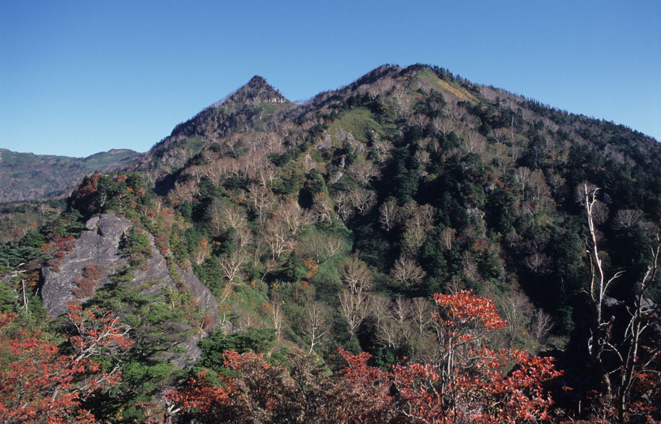 1998年10月11日、上州・武尊山(不動岳)より「前武尊(正面右のピーク)と剣ヶ峰(同・左のピーク)」を望む。