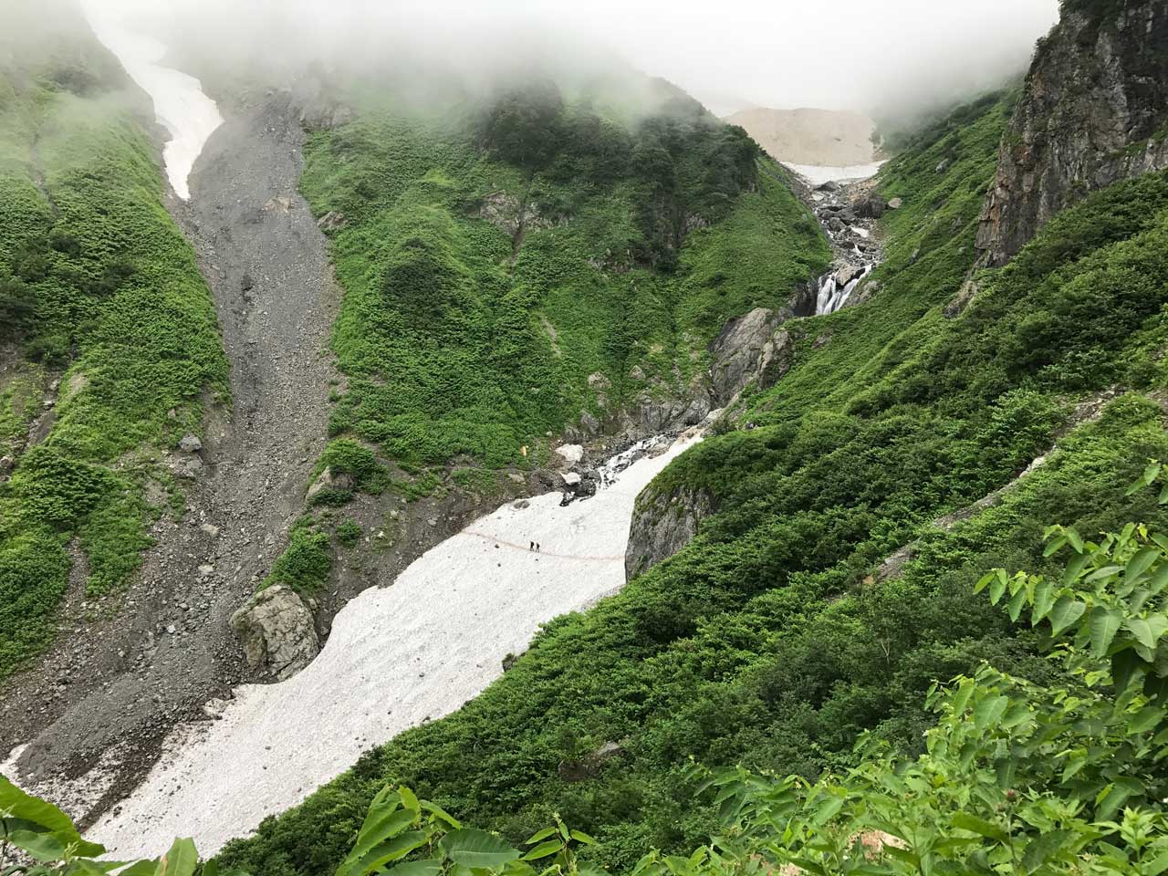 北アルプス白馬岳の登山口である「猿倉」から「鑓温泉」を経て、後立山連峰稜線の天狗山荘までは9時間を超える長丁場の道であり、秘境感漂う険路でもある。杓子岳双子尾根南面の山腹を巻く登山道は、豊富な残雪で夏道はいたるところ途切れていて、幾度となく雪渓の横断を余儀無くされる。硫黄臭の広がる鑓温泉は、山小屋もキャンプ場も大勢の登山者で溢れていて賑やかであるが、鑓温泉上部は急峻な鎖場の道が連続し、お花畑広がる「大出原(おいでっぱら)」まで気を抜けれない。