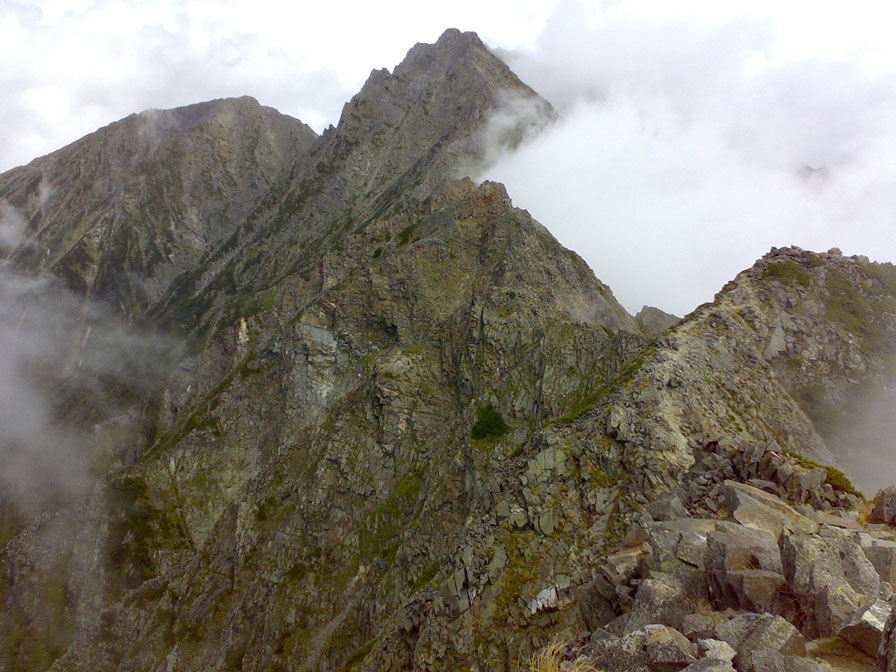 2007年9月24日、穂高岳稜線(天狗のコル〜西穂高岳)にてジャンダルムを写す。機材=ノキアN73(携帯電話)
