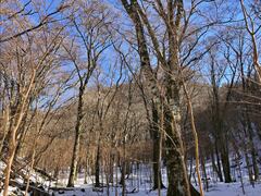 苔むした溶岩台地の上にブナとヒメシャラが混生するここ「皮子平」は、今は雪に覆われて我々以外踏み跡は見られません。頭上には天城山稜線の小岳1360mが、どっしりと山容を広げています。稜線までほんの少しばかり歩けば届くのですが、ここには別世界な静寂と生気が広がっていて、なかなか離れる気になりません。