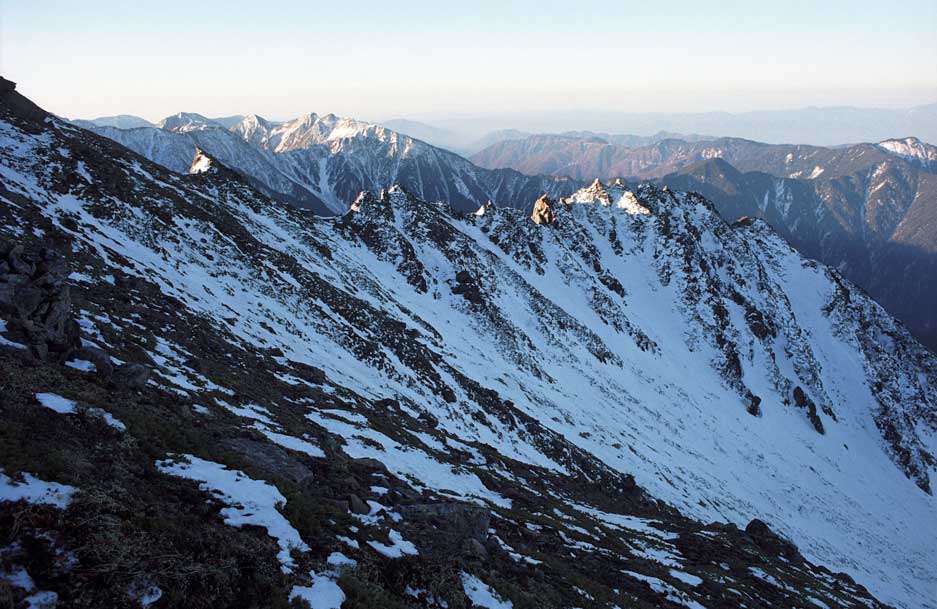 荒川前岳山頂から北に派生した尾根を登る。眼下は前岳カール、ギザギザの荒川前岳崩壊壁稜線が美しい! 稜線越しには、(中央右から)大沢岳2819m、中盛丸山2807m、兎岳2799mが続く。例年並の冬なら、烈風とラッセルに苦しめられる、最難関の道であるが・・・