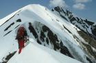 聖岳東尾根は南ア南部を代表するバリエーションルートで、大展望と高山性を秘め人気が高い。白蓬ノ頭2632mを越えるまで長いヤブが続くが、森林限界を超えると、尾根は聖沢(左)と赤石沢(右)にスッパリ切れ落ちナイフリッジが続く。白い浮雲が架かる三角錐の山が、奥聖岳2978m山頂だ。「沼津岳樺・沼津雲の峰山歩会」パーティ4人で聖岳東尾根〜赤石岳を縦走、二昔前の思いで深い山行の一つである。