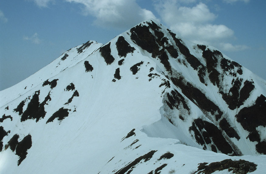 奥聖岳直下の雪壁である。足元は聖沢滝沢(左)と赤石沢大雪渓沢がルンゼとなって切れ落ち、高度感満点だ。雪面には割れが走り不気味である。通常ならアンザイレンして雪庇を乗り越さなければならないのだが、雪壁の張り出しは無く簡単に越えることが出来た。奥聖岳から聖岳3010mまでは、平坦な道が続く。振り返ると、眼下に急峻な東尾根が続き感慨深かった。