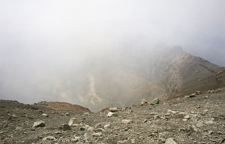 垂直に切り立った断崖。火口からは幾筋もの噴煙が立ち昇り、パチパチと岩の弾ける音が響く。白煙から、黒っぽい噴煙に変わることがあるので不気味だった。覗き込んだが、底は見ることが出来なかった。帰宅して、数ヶ月もしないうちに、小噴火のニュースが流れた・・・